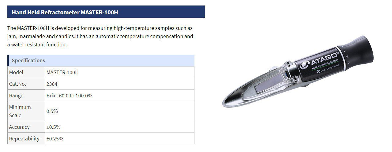 رفراکتومتر Master-100H Atago دستگاهی چشمی و دقیق برای اندازهگیری بریکس بالا در بازه 60 تا 100 درصد، مناسب عسل غلیظ، شربتها و مواد قندی با غلظت زیاد.