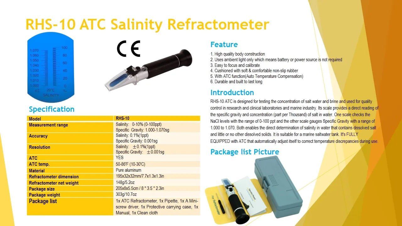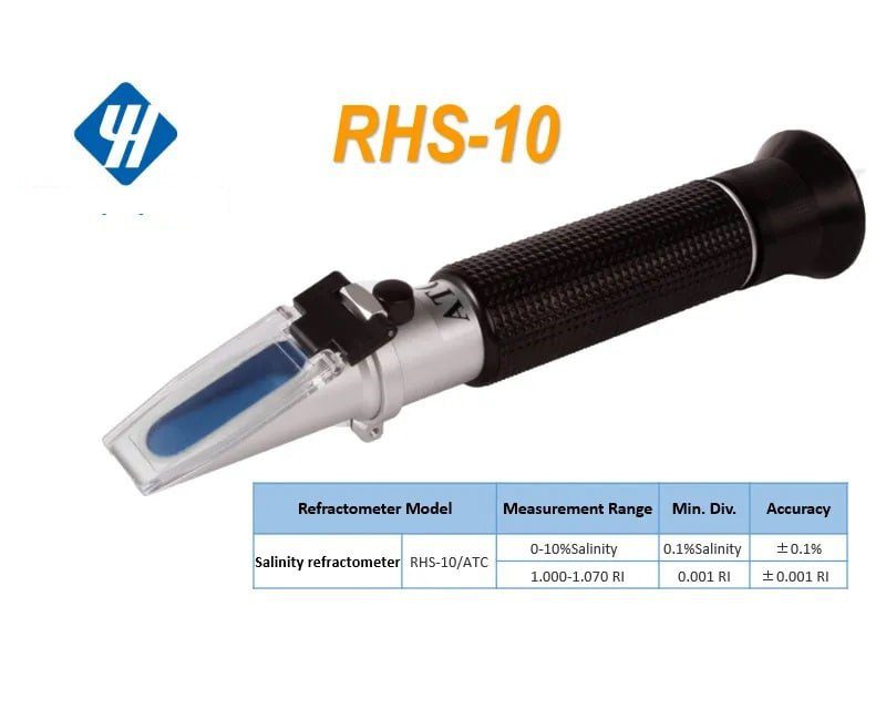 رفراکتومتر چشمی نمک RHS-10 ATC با اندازهگیری دقیق شوری در محدوده 0–10٪ و ضریب شکست 1.000–1.070 RI، مجهز به جبران دمای خودکار و مناسب آکواریوم، آزمایشگاه و کنترل کیفیت آب شور است.