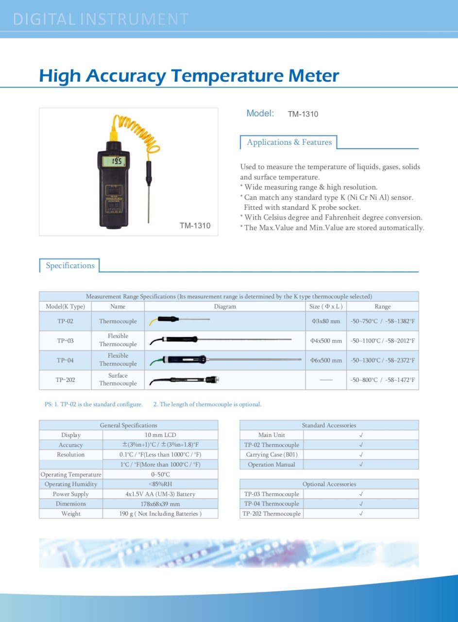 دماسنج دیجیتال TM‑1310 دستگاهی حرفهای برای اندازهگیری دقیق دما در مایعات، گازها و سطوح است؛ با پشتیبانی از ترموکوپل نوع K، نمایشگر خوانا، بازه وسیع تا ۱۳۰۰ °C و ذخیره خودکار مقادیر مین/ماکس.